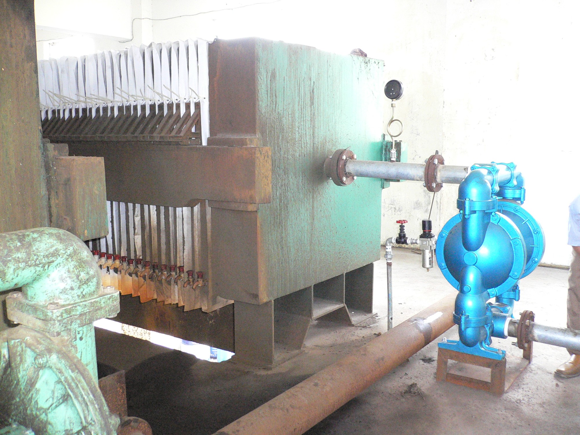 板块压滤机是依靠泵的流量为动力,流量是选泵的重要数据之一,泵的选型要根据设备的处理量以及处理周期为参考。其次,根据板框压滤机滤室的容积,脱水后泥的含水率,进板框前污泥的浓度,换算出板框每次完成一次脱水操作需要的进泥量。然后,确定合理的进泥时间,例如2-3小时。计算出流量。再次是气动隔膜泵材质:如果是普通的生物污泥,选用普通铸铁或者铝合金材质,比较经济。其他特殊污泥,要根据具体污泥成分,选用气动隔膜泵材质如PP,不锈钢304或316L,PVDF隔膜泵。