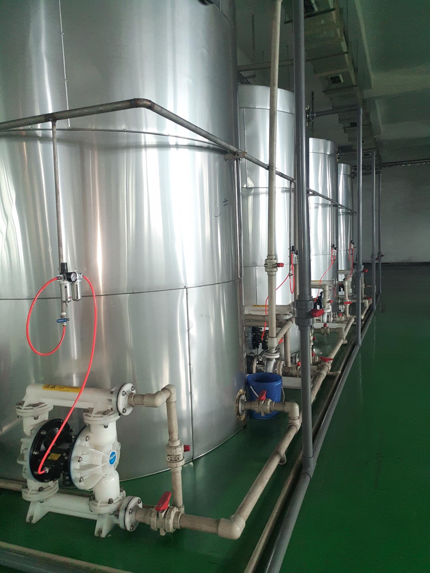 举例如下:车间内反应釜需添加盐酸,车间外有盐酸储罐,用气动隔膜泵从储罐输送到反应釜。以前用离心泵容易泄漏,泵寿命也不长,影响生产。